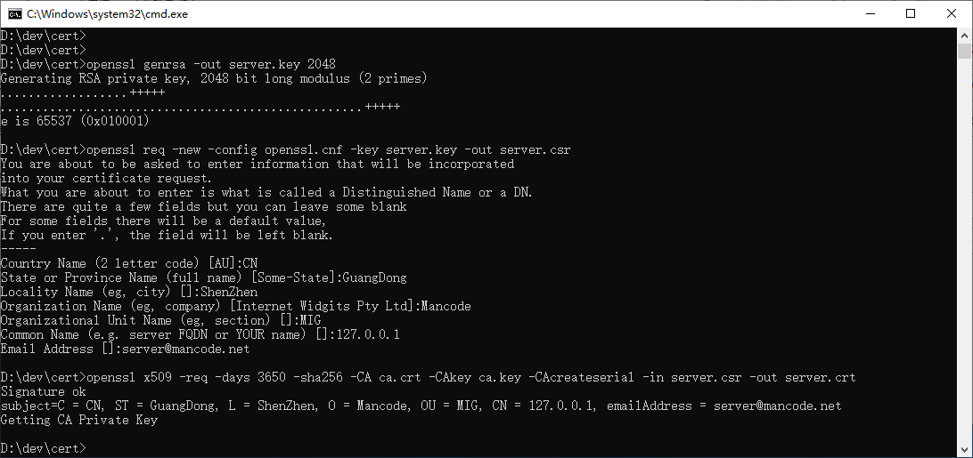 openssl req -new -config openssl.cnf -key server.key -out server.csr -subj "/C=CN/ST=GuangDong/L=ShenZhen/O=Mancode/OU=MIG/CN=127.0.0.1/emailAddress=server@mancode.net"