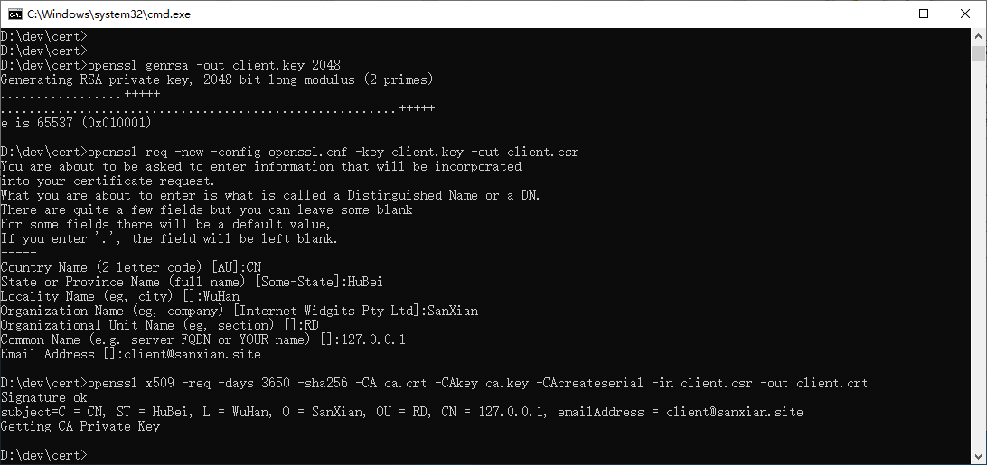 openssl req -new -config min.cnf -key client.key -out client.csr -subj "/C=CN/ST=HuBei/L=WuHan/O=SanXian/OU=RD/CN=127.0.0.1/emailAddress=client@sanxian.site"