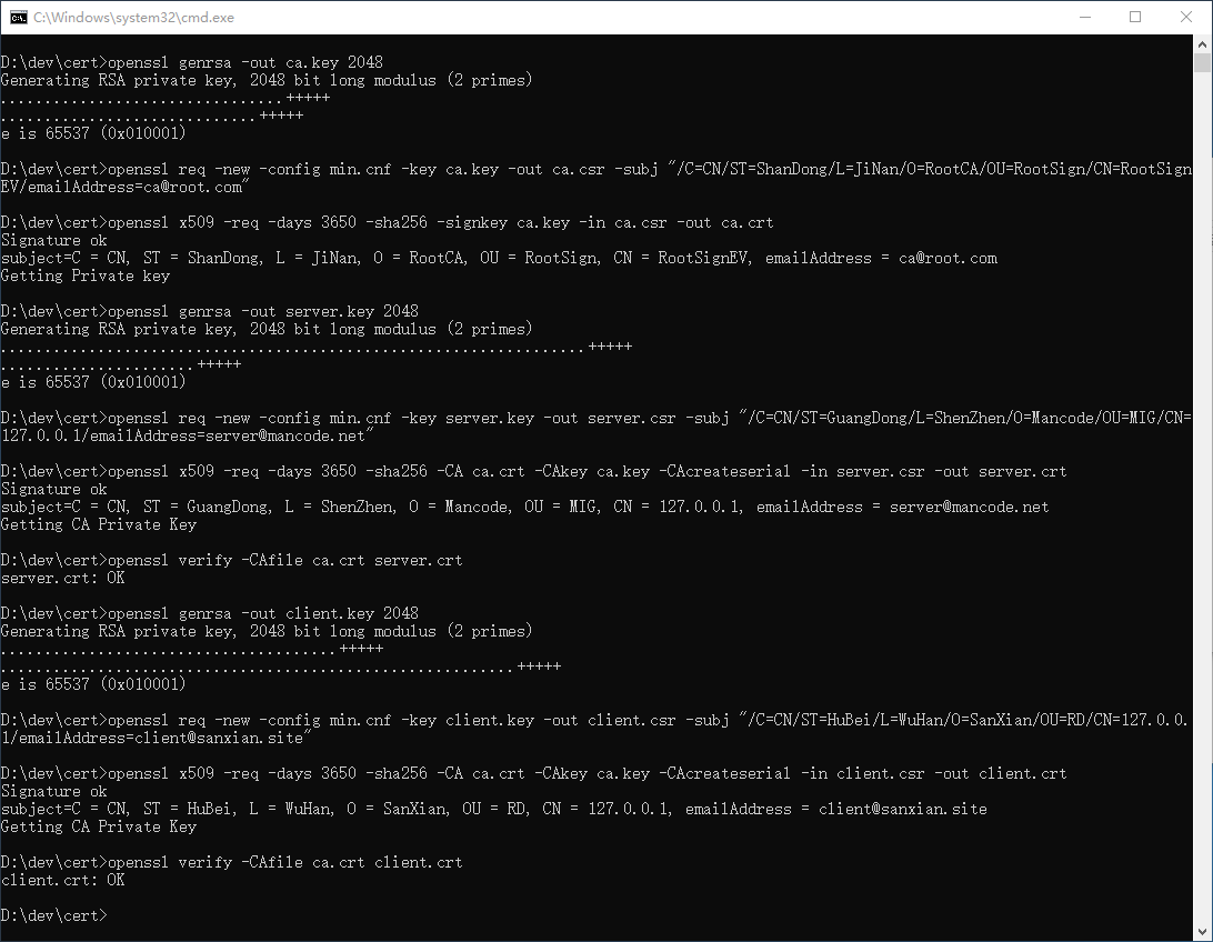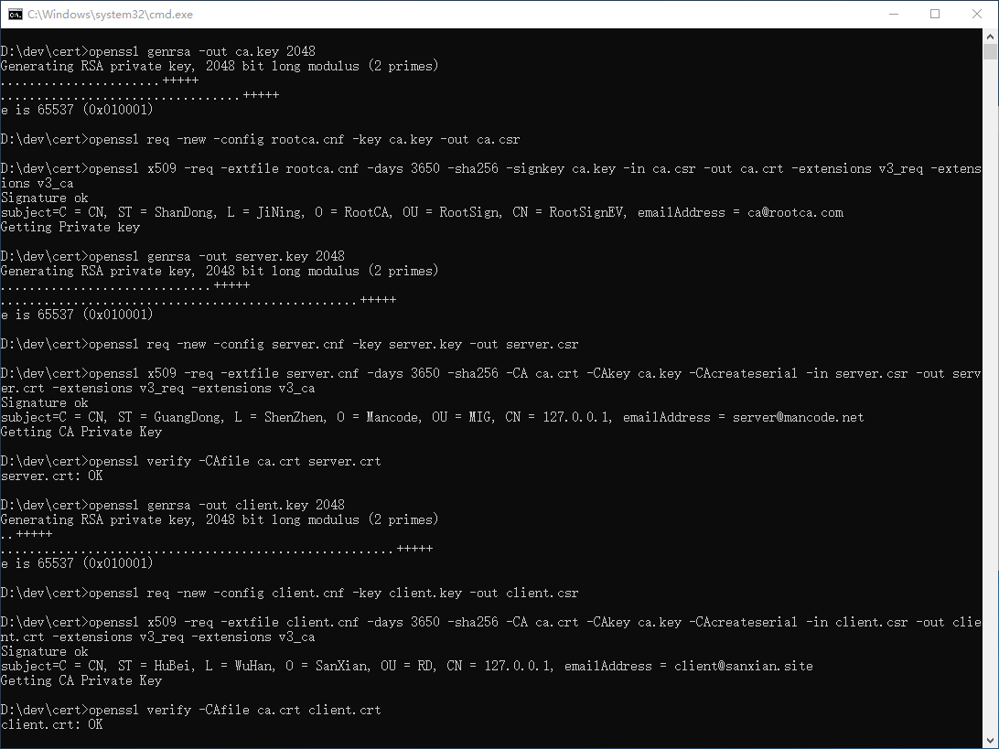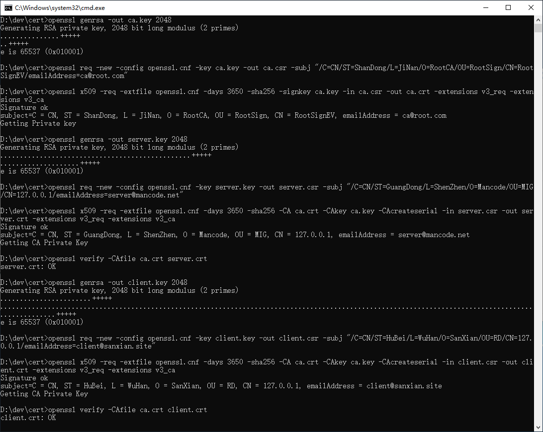 第四步,使用如下命令,依次生成根证书、服务端证书、客户端证书: