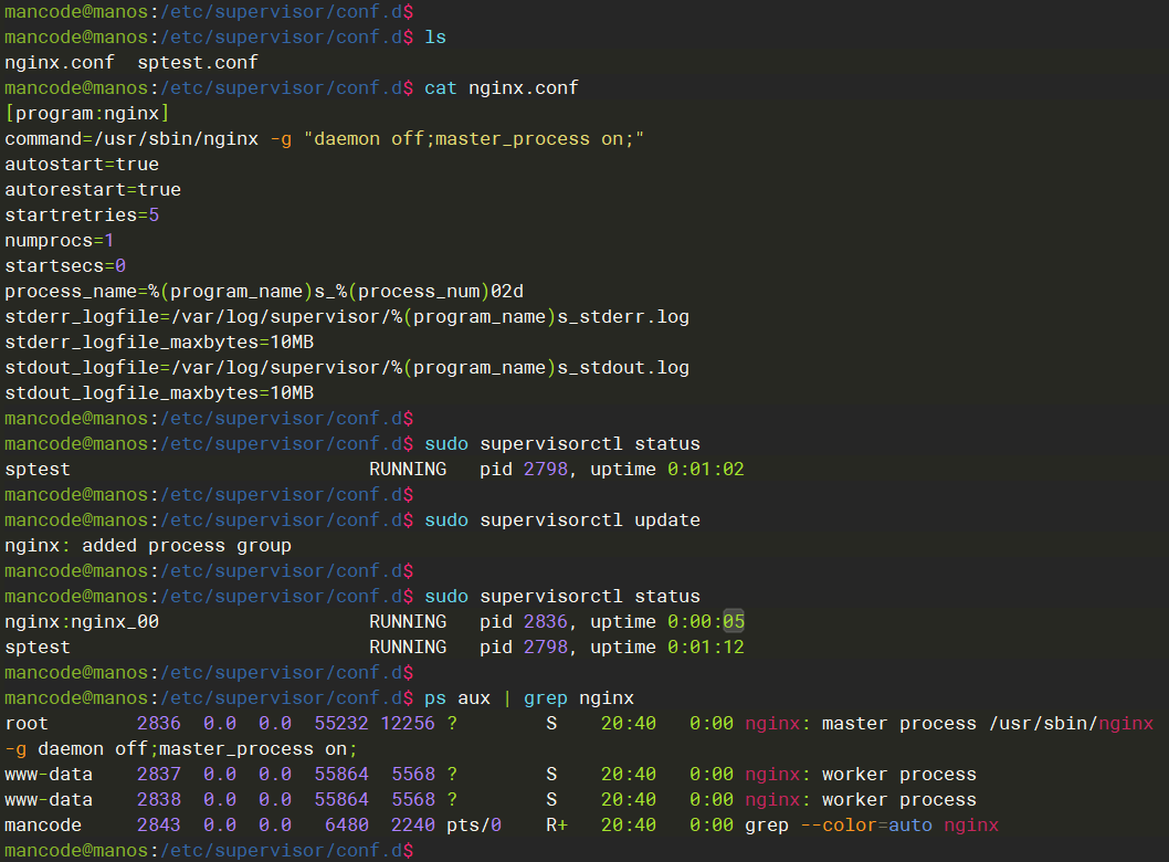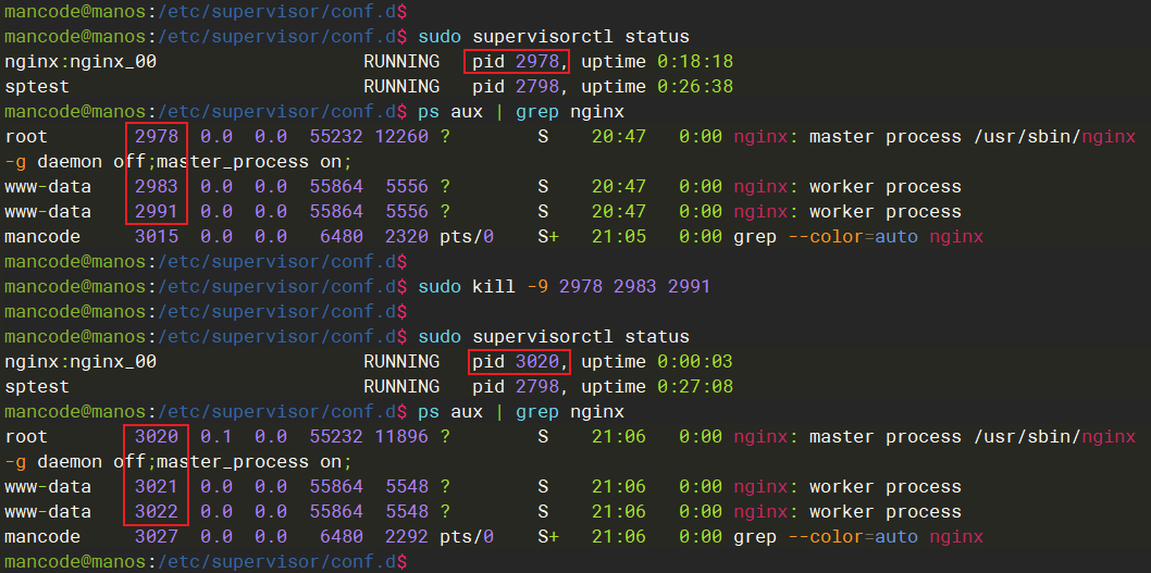 第三步,我们验证下supervisor是否可以自动重启nginx,用kill所有nginx进程的方法来模拟崩溃: