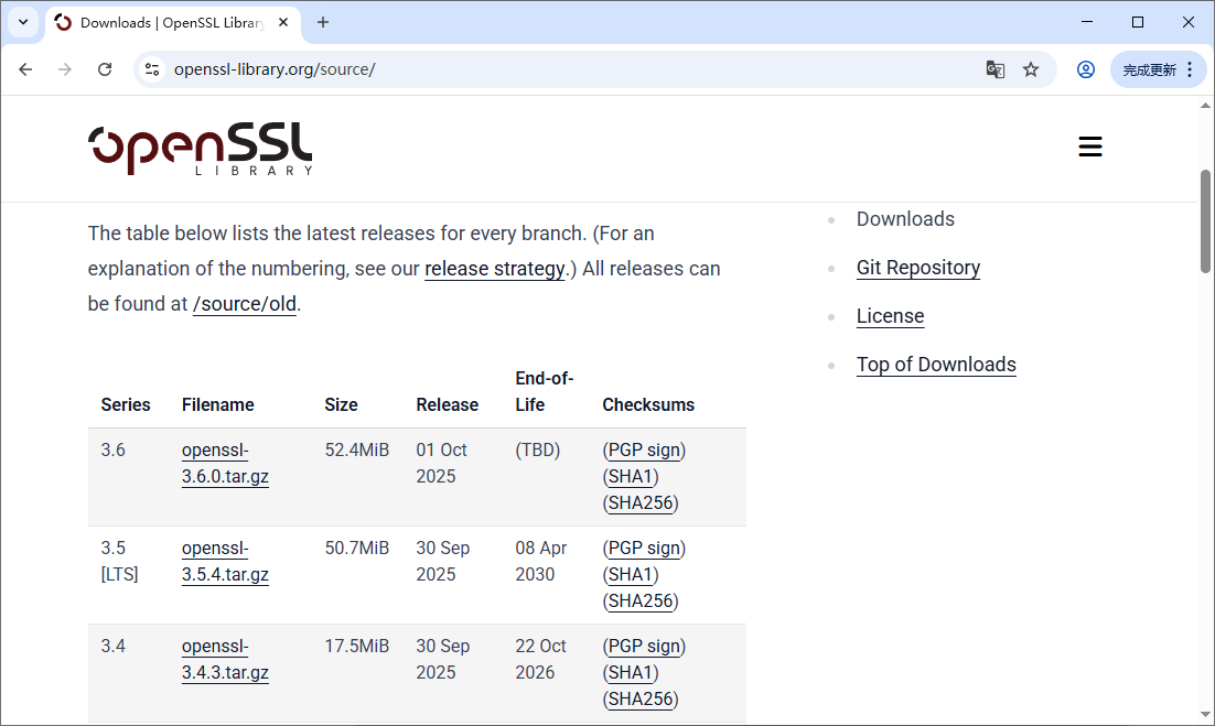 上述网页列出了OpenSSL的最新版本,我们根据自身或者公司的要求下载对应的版本,本文使用V1.1.1W版本进行演示。