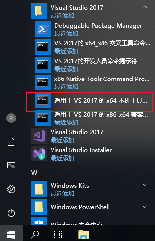 注意:在Windows上编译OpenSSL,需要使用Visual Studio自带的“适用于 VS 2017 的 x64 本机工具命令提示”进行编译,打开方法如下图所示: