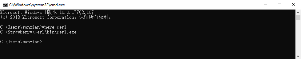 安装完毕之后,打开命令行窗口,输入where perl,如果能看到如下图所示的结果,则说明Strawberry Perl安装成功: