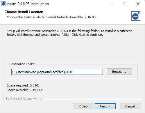 下载完毕之后,直接双击运行,使用默认选项进行安装即可,如下界面展示了NASM的默认安装路径:
