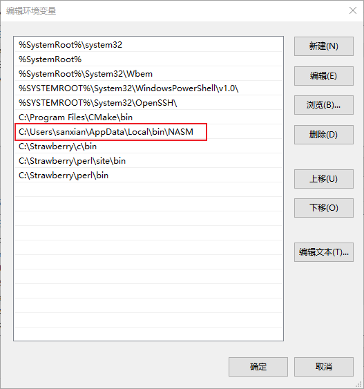 安装完毕之后,将NASM的安装路径放入系统环境变量中,如下图所示: