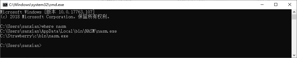 设置系统环境变量之后,打开命令行窗口,输入where nasm,如果能看到如下图所示的结果,则说明NASM安装成功: